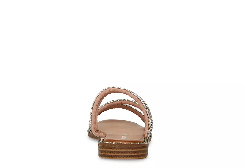 Upgrade your style with the Posh women’s slide sandal from madden girl. With an asymmetrical synthetic upper featuring rhinestone trim around the footbed and a square toe, this slip-on marks a stylish addition to your closet. The insole cushions while the durable outsole locks in your support.